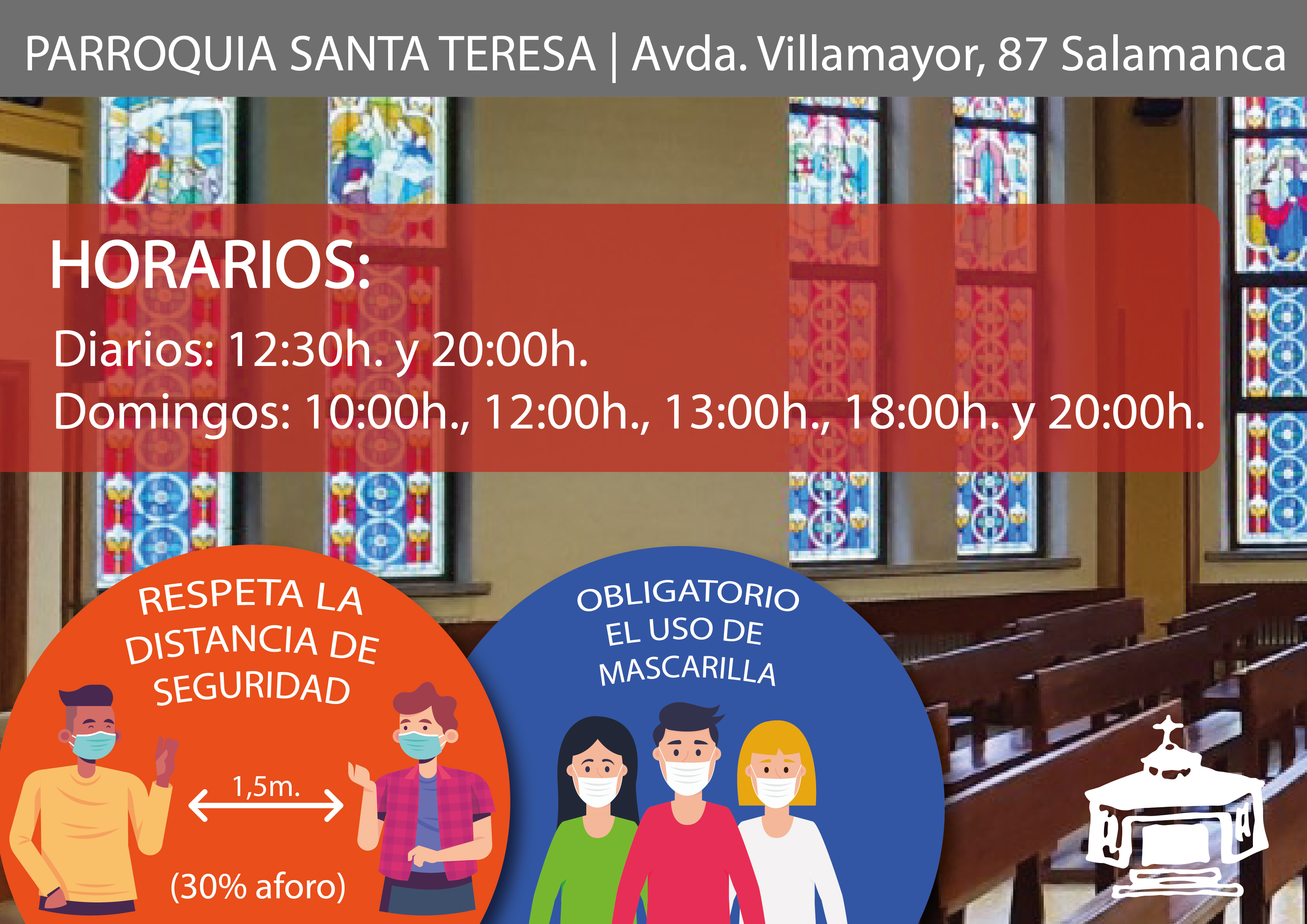 A partir de este lunes 18, se podrá acudir a misa de lunes a sábado a las 12:30 y a las 20:00h. y domingos a las 10:00, 12:00, 13:00, 18:00 y 20:00h, con mascarilla, aplicándose gel hidroalcohólico y sentándose en los extremos de los bancos.